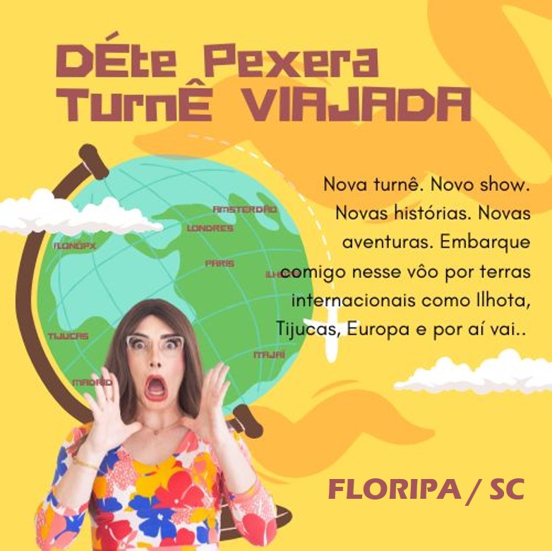 Com mais de 1 milhão de espectadores, Déte apresenta um espetáculo novinho, inspirado em sua jornada pelo mundo - de Ilhota e Tijucas até Europa e Reino Unido - colecionando histórias que ela não deveria contar (mas vai), perrengues internacionais, turbulências emocionais e descobertas que só uma Peixeira raiz vive e transforma em pura comédia.